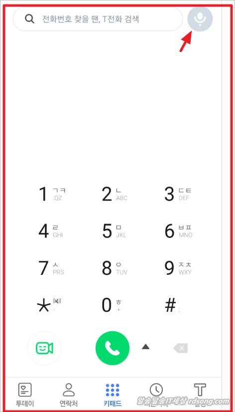 티전화 키패드 터치하여 띄운 모습 입니다. T설정 화면 우측하단 눌러 동의를 해야 합니다.