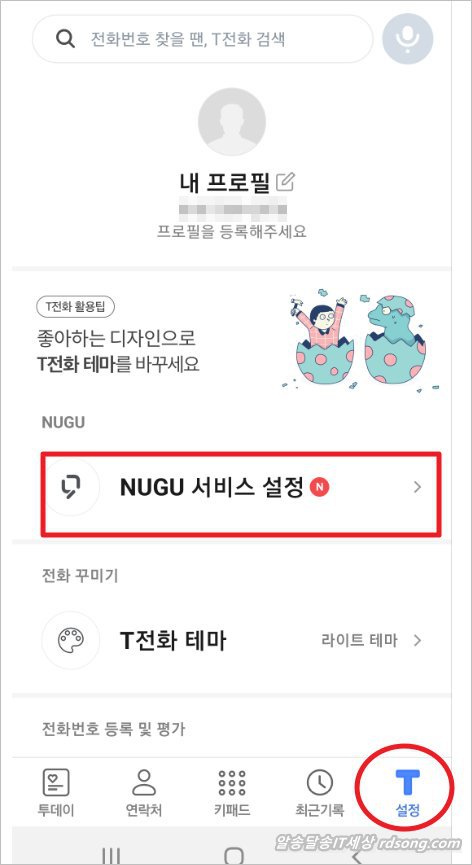 에이닷 t전화 업데이트 하고 나서 NUGU 서비스 설정에서 터치하여 들어가 보면 개인정보 수집 및 이용동의 하기를 해 줘야 합니다.