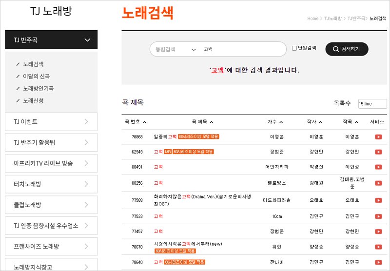 고백이란 노래검색 해 봤습니다.  가수 작사 작곡 맨 우측 서비스 클릭 해 보면 유튜브 검색되어 노래 반주 나옵니다