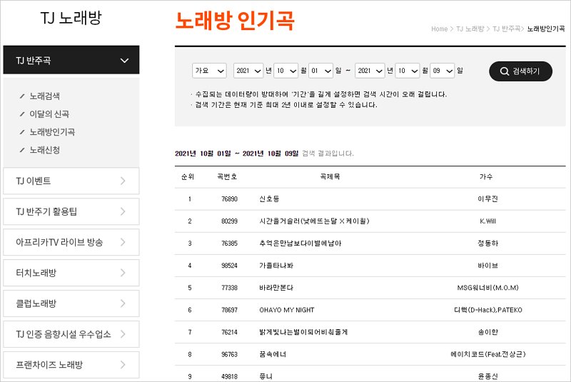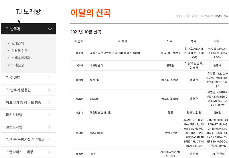 신곡이 뭔지 … 21년 10월 신곡 노래 곡번호 함께 나옵니다.