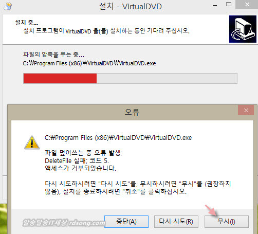 버추얼DVD 업데이트 도중에 파일덮어 쓰기 오류 코드 발생이 뜹니다 프로그램이 관리자 권한을 가지고 있지 않아 이런 문제가 발생할지 싶은데 확실하지는 않지만 ‘무시’를 하고 설치 완료를 한후 윈도우8.1을 재부팅 해 줬습니다