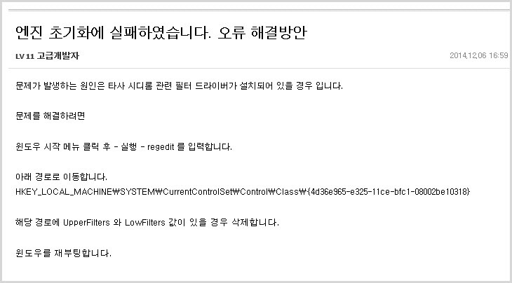 윈도우8.1에서 윈도우 업데이트가 있을 때 가끔 마운팅이 사라져서 재설치 한적도 있는데 이번에는  ‘엔진 초기화 실패 ‘가 떠서 확인을 누르고,
