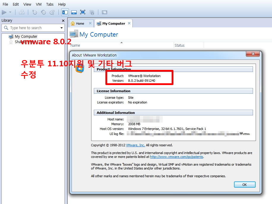 VMware Workstation 8.0.2 로 업데이트 하고 나면 우분투 11.10 버젼이 설치가 가능하며, 몇가지 버그가 개선되었습니다
