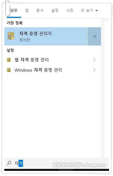 또는 윈도우10 좌측 하단 검색에서 자격 증명 관리자 입력 검색 하면 메뉴가 나옵니다